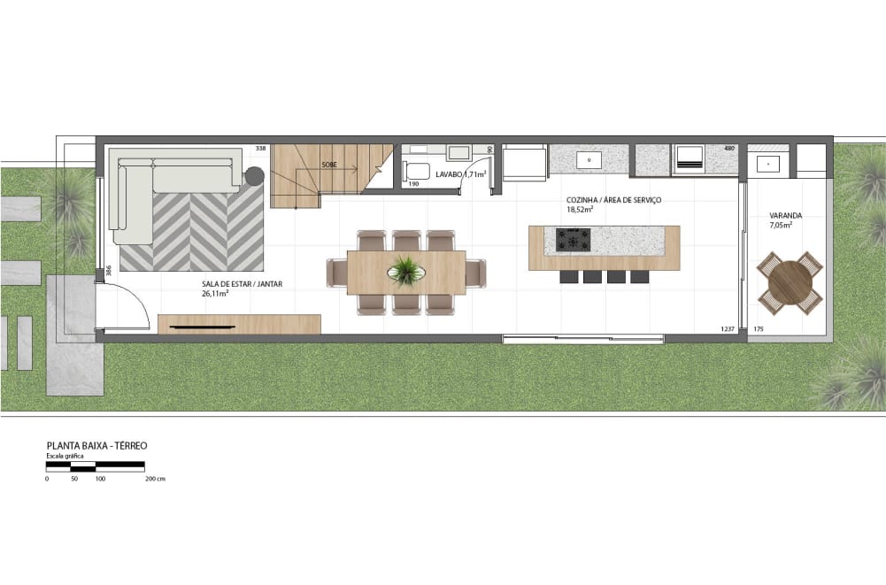 São três residências de dois pavimentos, geminadas com quintal e jardins privativos, a 200m da praia do Campeche, em um dos pontos mais nobres do bairro.